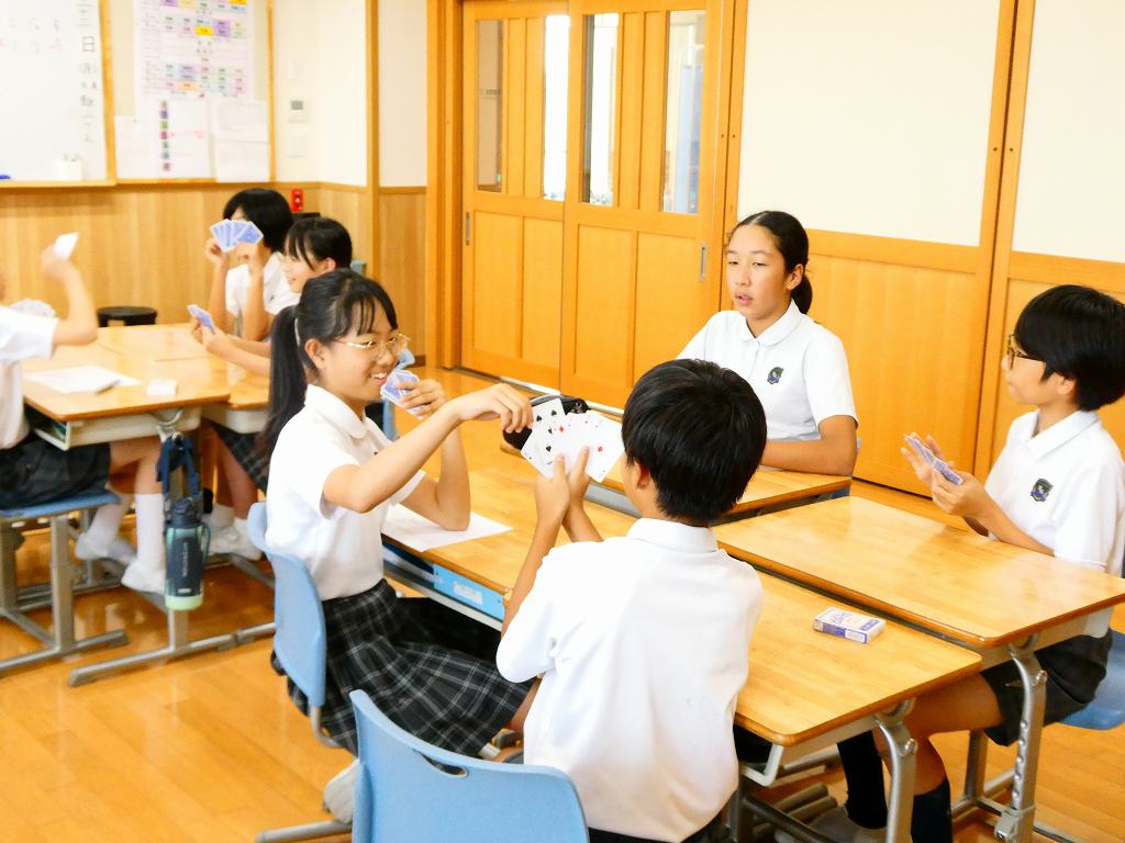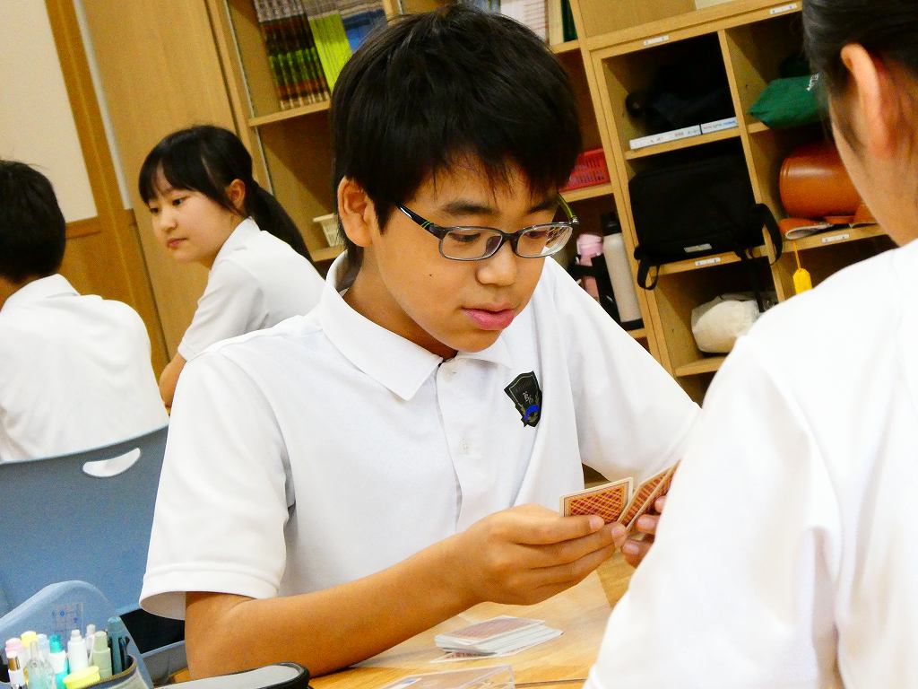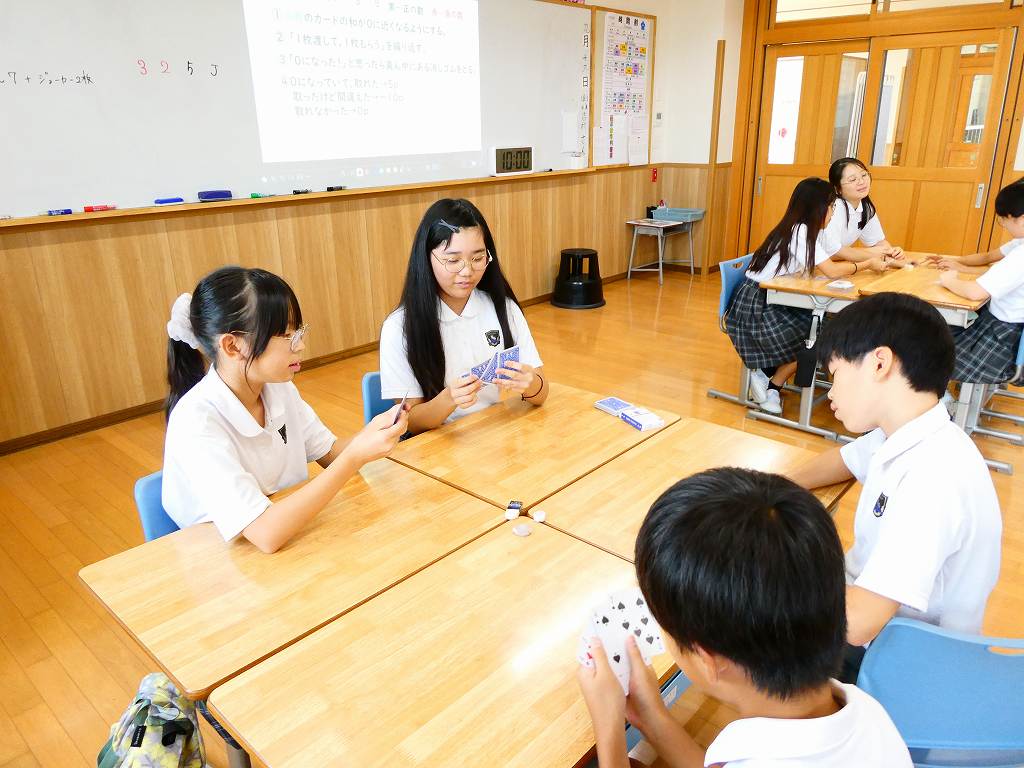 演習に取り組んだ後は、トランプを使ったゲームで計算のトレーニングをしました。黒のトランプを正の数、赤のトランプを負の数として計算をし、指定された勝利条件を目指します。