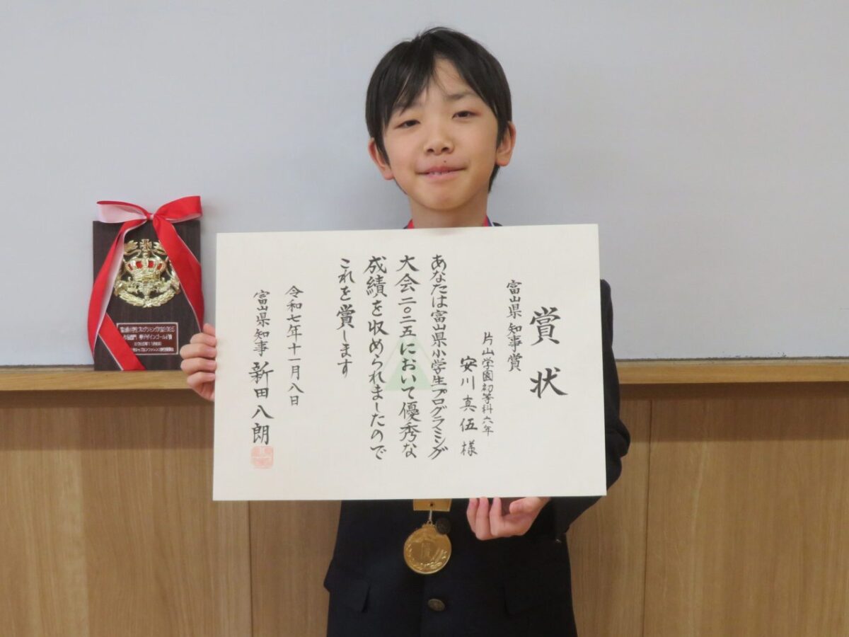 本校6年生の安川真伍さんが、「県小学生プログラミング大会」で最高賞の「ゴールド賞」に輝き、富山県知事賞を受賞しました。