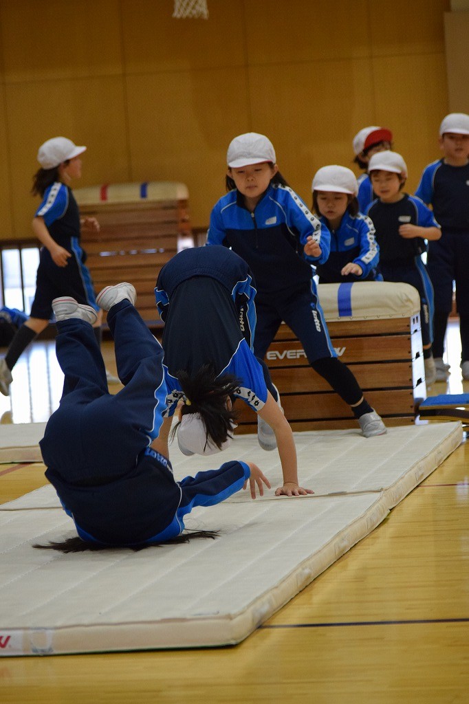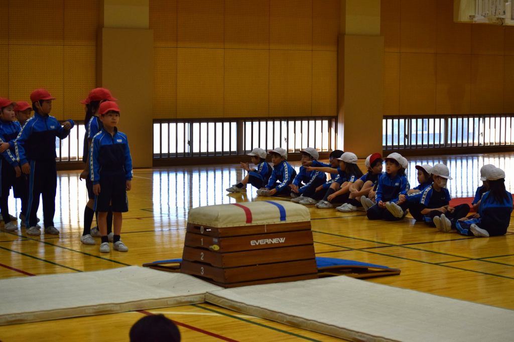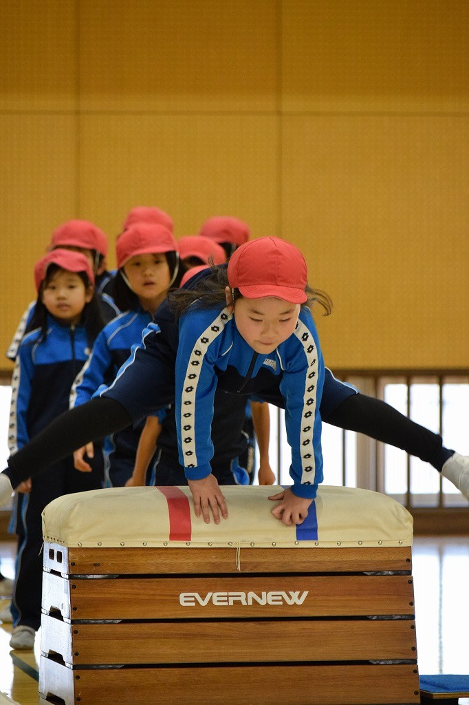 2年生の体育では、跳び箱をしています。練習をくり返し、最後に連続跳びの発表会を行いました。