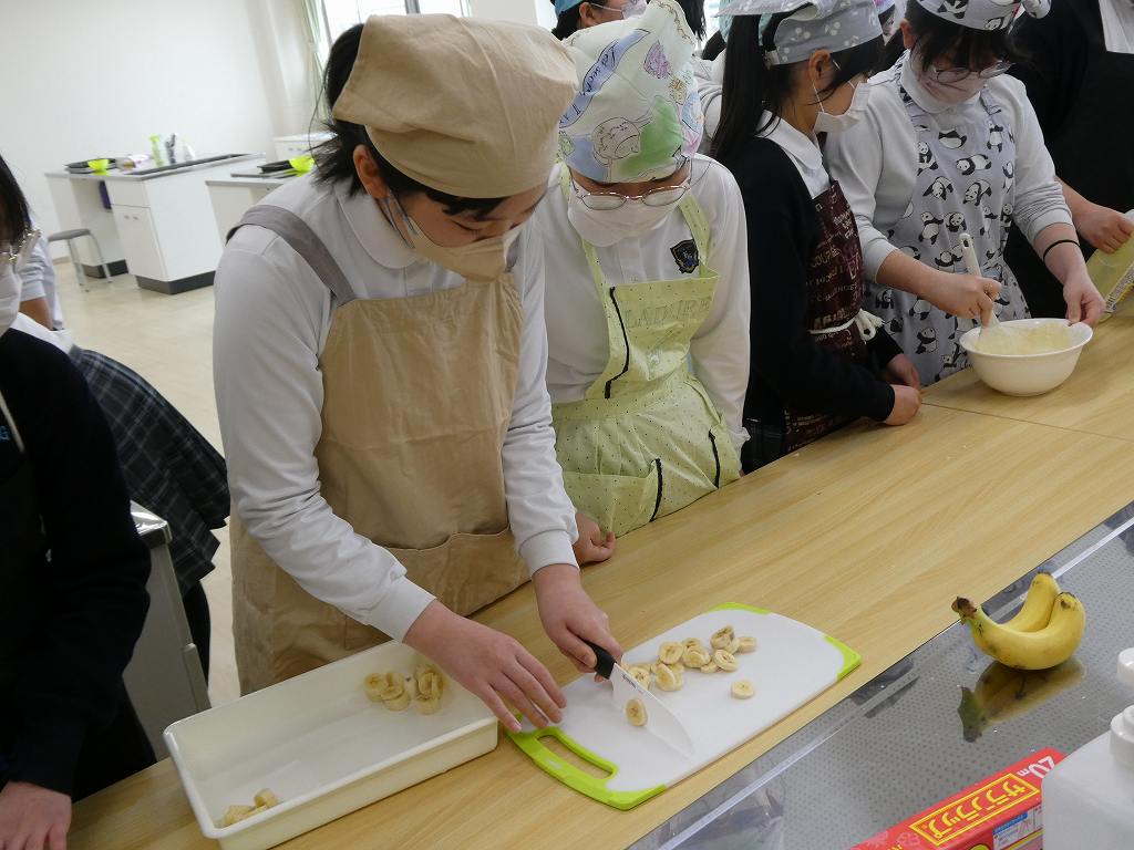 6年生は家庭科の調理実習でバナナマフィンを作りました。チョコやナッツなど、各班入れたいものを決め、オリジナリティのあるマフィンを作りました。